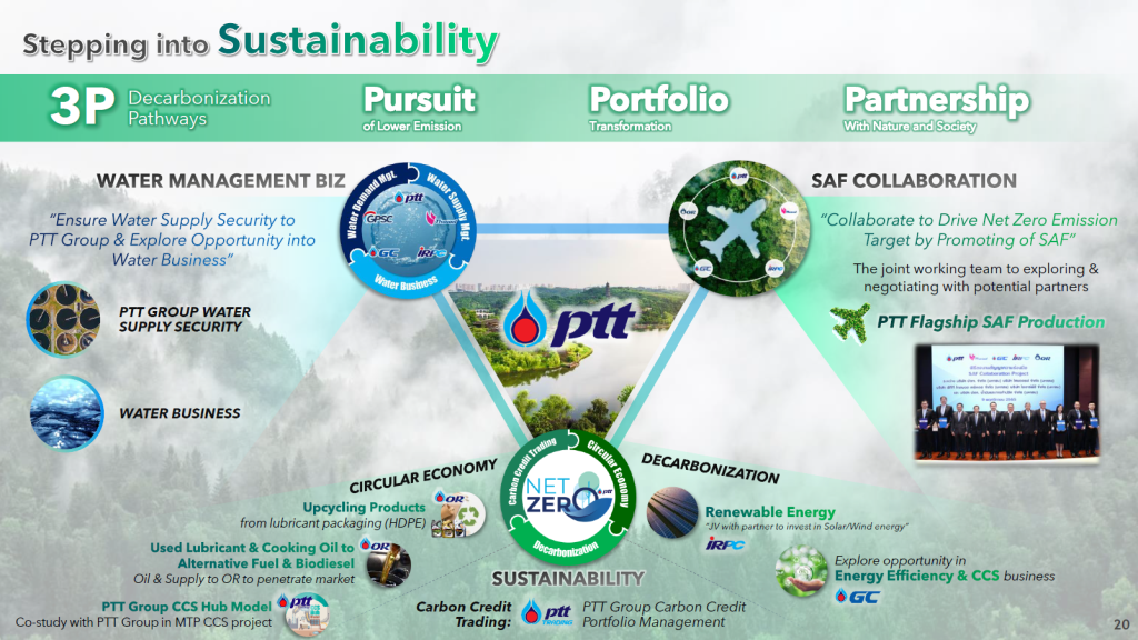 อย่างไรก็ตาม ปตท.ยังให้ความสำคัญด้านกลยุทธ์เพื่อการเติบโตอย่างยั่งยืน รองรับสภาวการณ์ของโลกที่เปลี่ยนแปลงไป สายงานกลุ่มธุรกิจปิโตรเลียมขั้นปลาย ปตท. ได้ผนึกพลังร่วมภายในกลุ่ม กำหนดแผนธุรกิจใหม่ภายใต้ความท้าทายด้านสิ่งแวดล้อม ประกอบด้วย การก้าวเข้าสู่ธุรกิจด้านการบริหารจัดการน้ำ (Water Management Business) รวมถึงแผนธุรกิจเพื่อสนับสนุนเป้าหมาย Net Zero Emissions ของกลุ่ม ปตท. อาทิ เตรียมการเป็นผู้ผลิตเชื้อเพลิงอากาศยานชีวภาพอย่างยั่งยืน (Sustainable Aviation Fuel – SAF) ผลักดันไทยให้เป็นศูนย์กลางการผลิตและใช้เชื้อเพลิงชีวภาพในเครื่องบิน ผลักดันความร่วมมือเศรษฐกิจหมุนเวียน (Circular Economy) และการลงทุนในธุรกิจที่มีการปลดปล่อยคาร์บอนต่ำ (Decarbonization) เป็นต้น