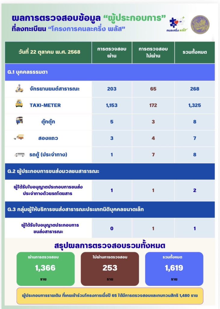 ทั้งนี้โครงการ คนละครึ่ง พลัส เปิดให้ผู้ประกอบการรถสาธารณะทุกประเภท ไม่ว่าจะเป็น แท็กซี่ มอเตอร์ไซค์รับจ้าง รถตุ๊กตุ๊ก รถสองแถว หรือรถตู้โดยสาร เพื่อเข้าร่วมในฐานะ “ร้านค้าขนส่ง” ให้ประชาชนสามารถใช้สิทธิร่วมจ่ายค่าเดินทางได้สะดวก สำหรับผู้ที่สนใจสามารถ ลงทะเบียนได้ตั้งแต่วันที่ 15 ตุลาคม 2568 จนถึง วันที่ 19 ธันวาคม 2568 โดยผ่านจุดรับลงทะเบียนที่ บูธ กระทรวงมหาดไทยร่วมกับธนาคารกรุงไทย หรือธนาคารกรุงไทยทุกสาขา ซึ่งเป็นช่องทางหลักสำหรับผู้ให้บริการและผู้ประกอบการสาธารณะ