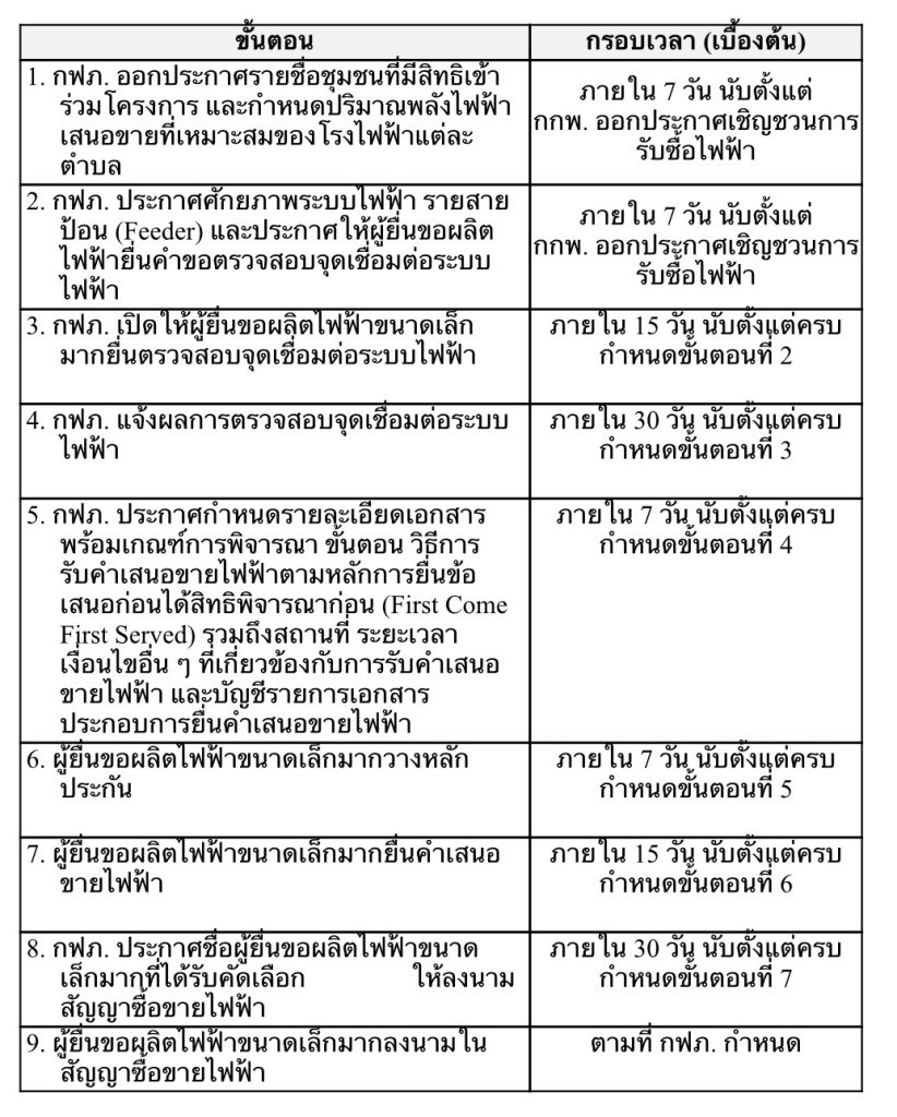 1. กฟภ. ออกประกาศรายชื่อชุมชนที่มีสิทธิเข้าร่วมโครงการ และกำหนดปริมาณพลังไฟฟ้าเสนอขายที่เหมาะสมของโรงไฟฟ้าแต่ละตำบล ภายใน 7 วัน นับตั้งแต่ กกพ. ออกประกาศเชิญชวนการรับซื้อไฟฟ้า