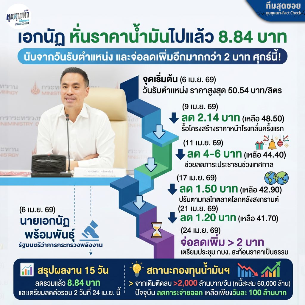 วันนี้ (21 เม.ย. 2569) เพจเฟสบุ๊ค ทีมสุดซอย-ทุบทุนเทา ได้โพสต์ข้อความสรุปภาพรวมการลดราคาน้ำมันนับตั้งแต่ นายเอกนัฏ พร้อมพันธุ์ รัฐมนตรีว่าการกระทรวงพลังงาน ในวันที่ 6 เมษายน 2569 มีการปรับลดราคาลงอย่างต่อเนื่อง เพื่อให้สอดคล้องกับกลไกตลาดโลกและการบริหารจัดการกองทุนน้ำมันเชื้อเพลิง ดังนี้