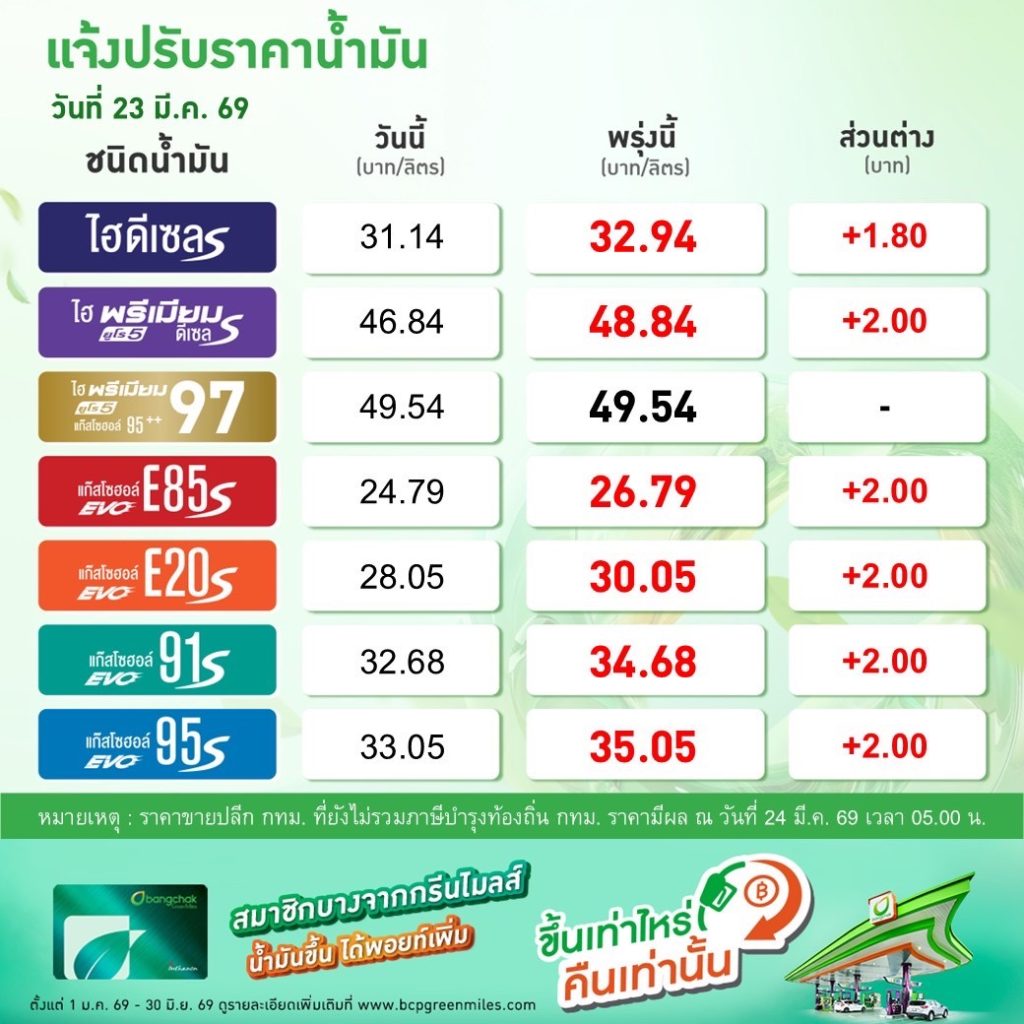 วันนี้ (23 มีนาคม 2569) นายพรชัย จิรกุลไพศาล ผู้อำนวยการสำนักนโยบายและแผน สำนักงานกองทุนน้ำมันเชื้อเพลิง เปิดเผยว่า วันนี้ ที่ประชุมคณะกรรมการบริหารกองทุนน้ำมันเชื้อเพลิง (กบน.) มีมติเห็นชอบในการปรับลดอัตราชดเชยราคาน้ำมันดีเซล ทำให้ราคาขายปลีกน้ำมันดีเซลในวันพรุ่งนี้ (24 มีนาคม 2569) จะอยู่ที่ 33 บาทต่อลิตร ซึ่งการปรับราคาเป็นผลมาจากสถานการณ์ความตึงเครียดในตะวันออกกลาง โดยเฉพาะภายหลังเหตุการณ์โจมตีอิหร่านที่ส่งผลให้ราคาน้ำมันดีเซลในตลาดสิงคโปร์ดีดตัวสูงขึ้นอย่างรุนแรง จาก 92 เหรียญสหรัฐต่อบาร์เรล พุ่งสูงถึง 223 เหรียญสหรัฐต่อบาร์เรล หรือเพิ่มขึ้นกว่า 131 เหรียญสหรัฐฯ ซึ่งคิดเป็นต้นทุนที่เพิ่มขึ้นถึง 26 บาทต่อลิตร ส่งผลให้กองทุนน้ำมันเชื้อเพลิงต้องแบกรับภาระชดเชยสูงถึงวันละเกือบ 2,400 ล้านบาท หรือประมาณ 70,000 ล้านบาทต่อเดือน จึงมีความจำเป็นเร่งด่วนในการปรับลดภาระเพื่อให้กองทุนฯ ยังคงมีสภาพคล่องในการรักษาเสถียรภาพราคาในระยะยาว