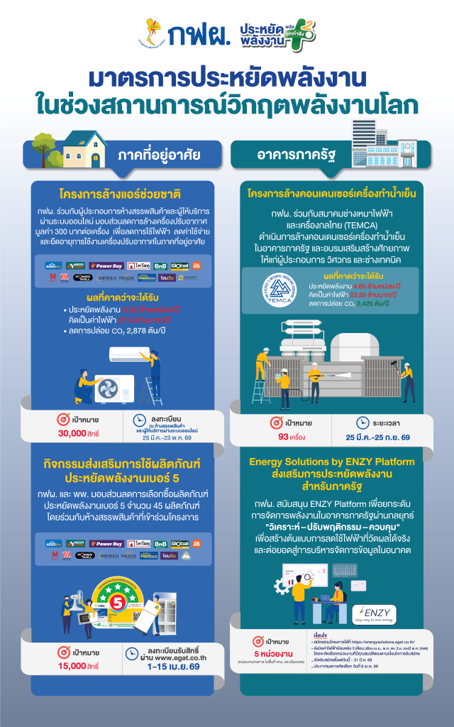 กฟผ. ร่วมกับผู้ประกอบการห้างสรรพสินค้าและผู้ให้บริการผ่านระบบออนไลน์ รวม 13 รายทั่วประเทศ มอบส่วนลดการล้างเครื่องปรับอากาศมูลค่า 300 บาทต่อเครื่อง จำนวน 30,000 สิทธิ์ ซึ่งคาดว่าจะลดการใช้พลังงานไฟฟ้าได้ประมาณ 5.6 ล้านหน่วย และลดปริมาณการปล่อยก๊าซคาร์บอนไดออกไซด์ กว่า 2,900 ตัน โดยสามารถลงทะเบียน ณ ห้างสรรพสินค้าและผู้ให้บริการผ่านระบบออนไลน์ ตั้งแต่วันที่ 25 มีนาคม 2569 เป็นต้นไป