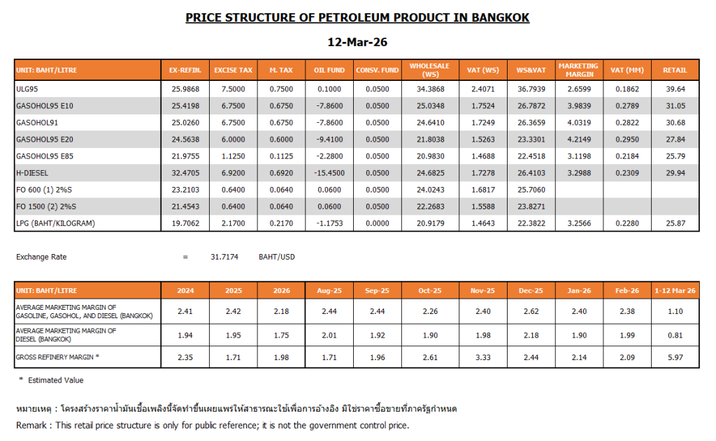 ด้าน สำนักงานนโยบายและแผนพลังงาน (สนพ.) เปิดเผย ข้อมูลโครงสร้างราคาน้ำมันล่าสุด ณ วันที่ 12 มี.ค. 2569 พบว่า ค่าการกลั่นเฉลี่ย ระหว่างวันที่ 1- 12 มี.ค. 2569 อยู่ที่ 5.97 บาทต่อลิตร จากเดือน ก.พ. ที่ผ่านมา มีค่าการกลั่นเฉลี่ยอยู่ที่ 2.09 บาทต่อลิตร และค่าการกลั่น เฉลี่ยในปี 2568 อยู่ที่ 1.71 บาทต่อลิตร ขณะที่ปี 2567 มีค่าการกลั่นเฉลี่ยอยู่ที่ 2.35 บาทต่อลิตร