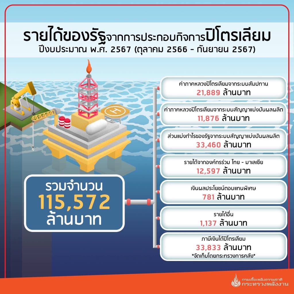 ขณะที่ การจัดเก็บรายได้เข้ารัฐจากการประกอบกิจการปิโตรเลียม ในปีงบประมาณ พ.ศ. 2567 (ตุลาคม 2566-กันยายน 2567) จำนวนรวมทั้งสิ้น 115,572 ล้านบาท โดยรายได้ที่จัดเก็บโดยกรมเชื้อเพลิงธรรมชาติ กระทรวงพลังงาน ประกอบด้วย