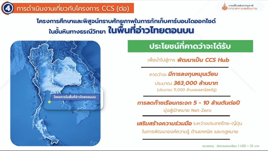1) โครงการศึกษาและพิสูจน์ทราบศักยภาพในการกักเก็บก๊าซคาร์บอนไดออกไซด์ (CO2)ในชั้นหินทางธรณีวิทยาในพื้นที่อ่าวไทยตอนบน มีเป้าหมายเพื่อนำไปสู่การพัฒนาเป็น Eastern CCS Hub ในการกักเก็บ CO2 โดยกรมเชื้อเพลิงฯ ร่วมกับ หน่วยงานของประเทศญี่ปุ่น (JOGMEG และ INPEX) เพื่อศึกษาและประเมินศักยภาพการกักเก็บก๊าซคาร์บอนไดออกไซด์ (CO2) ซึ่งภายหลังจากคณะรัฐมนตรีเห็นชอบในการเข้าสำรวจและมอบหมายภารกิจหน่วยงานที่เกี่ยวข้องเมื่อวันที่ 6 ม.ค. 2569 แล้วนั้น คาดว่า จะมีเม็ดเงินลงทุนหมุนเวียน ประมาณ 363,000 ล้านบาท ลดก๊าซเรือนกระจก 5-10 ล้านตันต่อปี