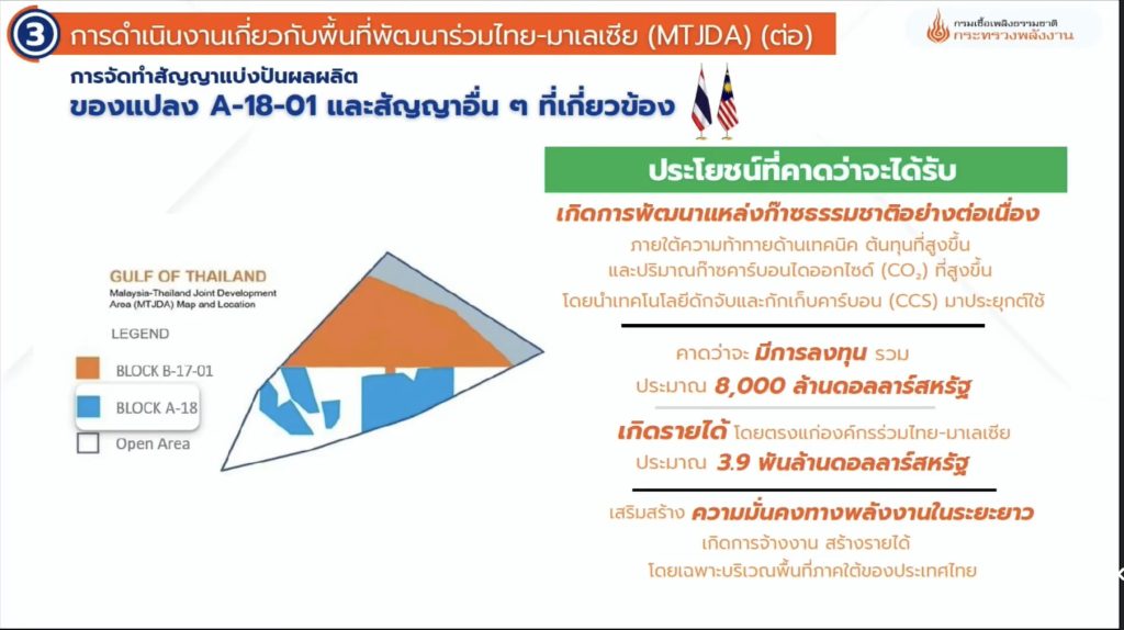 นอกจากนั้น ได้มีการจัดทำสัญญาแบ่งปันผลผลิตของแปลง A-18-01 และสัญญาอื่น ๆ ที่เกี่ยวข้อง เพื่อสนับสนุนให้เกิดการพัฒนาแหล่งก๊าซธรรมชาติอย่างต่อเนื่อง ภายใต้ความท้าทายทั้งด้านเทคนิค ต้นทุนที่สูงขึ้นโดยจะมีการประยุกต์ใช้เทคโนโลยีดักจับและกักเก็บคาร์บอน (CCS) เพื่อให้เกิดประโยชน์สูงสุด คาดว่าจะมีการลงทุนรวม 8,000 ล้านดอลลาร์สหรัฐ และจะก่อให้เกิดรายได้โดยตรงแก่องค์กรร่วมไทย – มาเลเซีย ประมาณ 3.9 พันล้านดอลลาร์สหรัฐ โดยแปลงนี้จะต้องรอนำเสนอ ครม.ชุดใหม่ ก่อนลงนามภายใต้สัญญาPSC ต่อไป