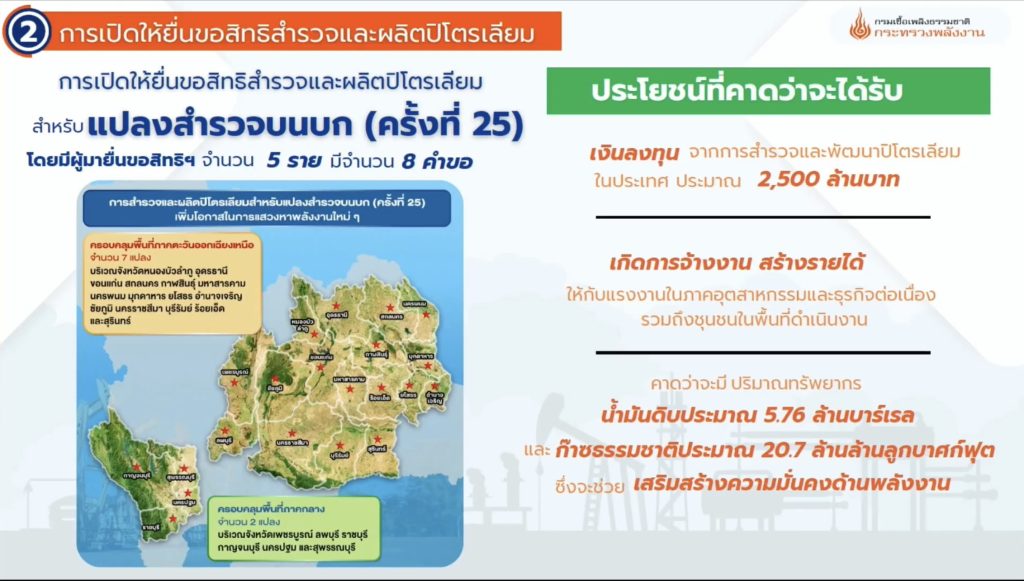 การเปิดให้ยื่นขอสิทธิสำรวจและผลิตปิโตรเลียม กรมเชื้อเพลิงธรรมชาติ ในฐานะหน่วยงานที่มีภารกิจในการสนับสนุน และเร่งรัดการจัดหาพลังงาน โดยการส่งเสริมและเร่งรัดการสำรวจและพัฒนาแหล่งเชื้อเพลิงธรรมชาติในประเทศได้ส่งเสริมการดำเนินการเปิดให้สิทธิสำรวจและผลิตปิโตรเลียมทั้งบนบกและในทะเลอย่างต่อเนื่อง โดยสำหรับการเปิดให้ยื่นขอสิทธิสำรวจและผลิตปิโตรเลียมสำหรับแปลงสำรวจบนบก (ครั้งที่ 25) ซึ่งภายหลังจากการออกประกาศเชิญชวนการเปิดให้ยื่นขอสิทธิฯ ไปแล้วนั้น ได้มีผู้มายื่นขอสิทธิฯ จำนวน 5 ราย 8 คำขอ คาดว่าสามารถเกิดการลงทุนราว 2,500 ล้านบาท เกิดการจ้างงาน สร้างรายได้ในอุตสาหกรรมและธุรกิจต่อเนื่อง ซึ่งหากพัฒนาได้เชิงพาณิชย์จะมีปริมาณน้ำมันดิบประมาณ 5.76 ล้านบาร์เรล ก๊าซธรรมชาติประมาณ 20.7 ล้านล้านลูกบาศก์ฟุต ขณะนี้อยู่ระหว่างพิจารณาผู้ได้รับคัดเลือกเพื่อนำเสนอคณะรัฐมนตรี(ครม.ชุดใหม่) และคาดว่าจะสามารถให้สัมปทานปิโตรเลียมได้ภายในปี 2569
