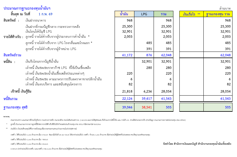 สำนักงานกองทุนน้ำมันเชื้อเพลิง (สกนช.) เปิดเผยฐานะเงินกองทุนน้ำมันเชื้อเพลิง ล่าสุด ณ วันที่ 1 กุมภาพันธ์ 2569 กลับมาเป็นบวก อยู่ที่ 505 ล้านบาท แบ่งเป็นบัญชีน้ำมัน อยู่ที่ 39,046 ล้านบาท และบัญชี LPG ติดลบ อยู่ที่ 38,541 ล้านบาท ขณะที่ยังมีหนี้สินรวมอยู่ 61,543 ล้านบาท