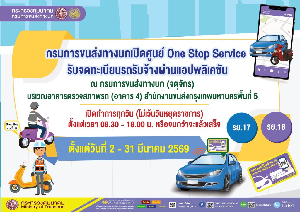 1. จัดตั้งศูนย์ One Stop Service รับจดทะเบียนรถรับจ้างผ่านแอปพลิเคชันครบจบในที่เดียว ตั้งแต่การลงทะเบียนหรือขอความเห็นชอบ ตรวจสภาพรถ ตรวจสอบเอกสารหลักฐาน และจดทะเบียนเปลี่ยนประเภทรถ พร้อมกับรับชำระค่าธรรมเนียมและภาษี (ถ้ามี) ณ บริเวณอาคารตรวจสภาพรถ (อาคาร 4) สำนักงานขนส่งกรุงเทพมหานครพื้นที่ 5 กรมการขนส่งทางบก (จตุจักร) ตั้งแต่วันที่ 2 – 31 มีนาคม 2569 (ไม่เว้นวันหยุดราชการ) ระหว่างเวลา 08.30 – 18.00 น. หรือจนกว่าจะแล้วเสร็จ