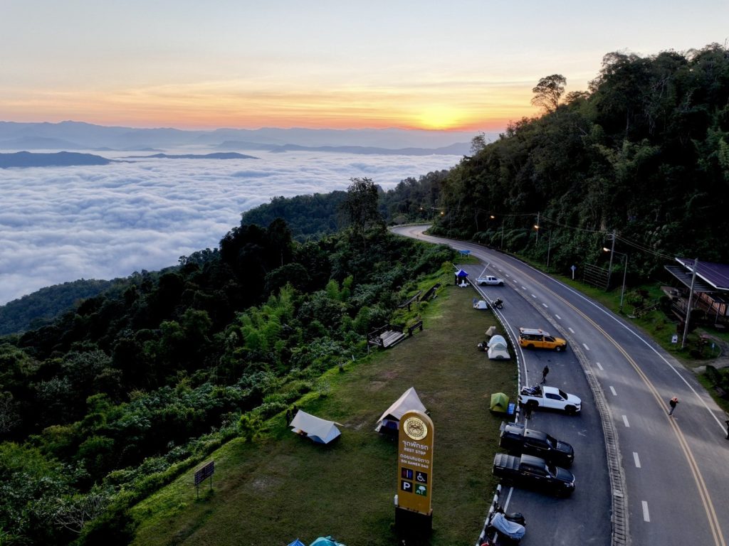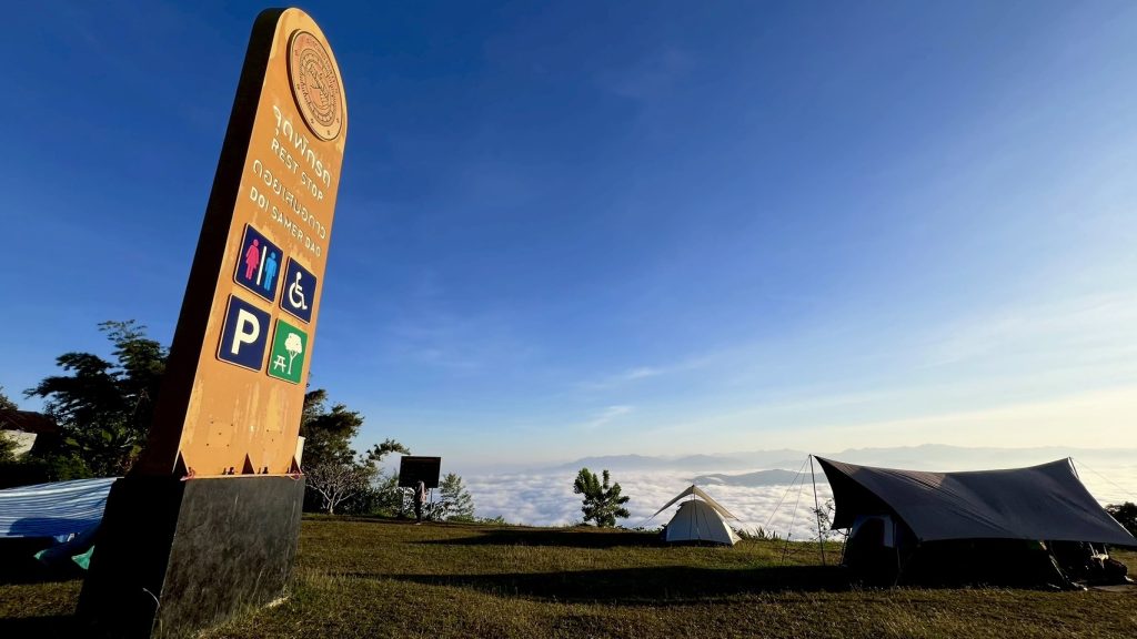 ลานกางเต็นท์ขนาดเล็กข้างจุดพักรถ คือความสุขสำหรับคนรักการแคมปิ้ง ตั้งเก้าอี้ตัวโปรด นั่งจิบเครื่องดื่มอุ่น ๆ ท่ามกลางลมหนาว โดยมีเบื้องหน้าเป็นทะเลหมอกสีขาว คล้ายผ้านวมขนาดใหญ่ที่ห่มคลุมหุบเขาราวกับธรรมชาติกำลังโอบกอดผู้มาเยือน ประกอบกับภาพพระอาทิตย์ยามเช้าที่ค่อย ๆ แทรกซึมผ่านหมอกบาง สีทองอุ่นที่ขับให้ขอบฟ้าเปล่งประกาย แค่นี้ก็สุขสุดใจ