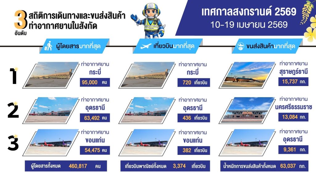 ทย. เปิดตัวเลขการเดินทางผ่านท่าอากาศยานช่วงสงกรานต์ ระหว่าง 10 – 19 เม.ย. 69 ผู้โดยสารทะลุ 4.5 แสนคน “กระบี่-อุดร-ขอนแก่น” ครอง 3 อันดับแรก
