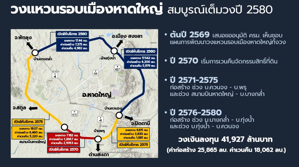 จากนั้นทล.จะนำเสนอครม.ขออนุมัติเห็บชอบหลักการก่อสร้างโครงการวงแหวนหาดใหญ่ผนวกเรื่องบริหารจัดการน้ำไว้ด้วย เนื่องจากเห็นว่าหลังเกิดปัญหาน้ำท่วมควรมีระบบช่วยระบายน้ำ เพราะหาดใหญ่ถือเป็นเมืองเศรษฐกิจอันดับต้นของประเทศ และเมื่อได้รับการอนุมัติก็จะเข้าสู่ขั้นตอนการออก พ.ร.ฎ.เวนคืนเขตที่ดิน เบื้องต้นวางแผนเสนองบประมาณจัดกรรมสิทธิ์ที่ดินไว้ในร่างคำของบประมาณปี 2570 โดยจะแบ่งการก่อสร้างเป็น 2 เฟส ได้แก่เฟสที่ 1 ปี 2571-2575 ช่วงบ้านควนจง-บ้านพรุ ระยะทาง 6.61 กม. และช่วงสนามบิน-บ้านบางกล่ำ ระยะทาง 18.07 กม. คาดแล้วเสร็จเปิดให้บริการปี 2575 ขณะที่เฟสที่ 2 ปี 2576-2580 ช่วงบ้านบางกล่ำ-บ้านทุ่งน้ำ ระยะทาง 17.44 กม. และช่วงบ้านทุ่งน้ำ-บ้านควนจง ระยะทาง 17.54 กม. คาดแล้วเสร็จเปิดให้บริการปี 2580 ทั้งนี้เมื่อโครงการแล้วเสร็จจะช่วยแบ่งเบา การจราจรแออัดในเขตเมืองหาดใหญ่ได้