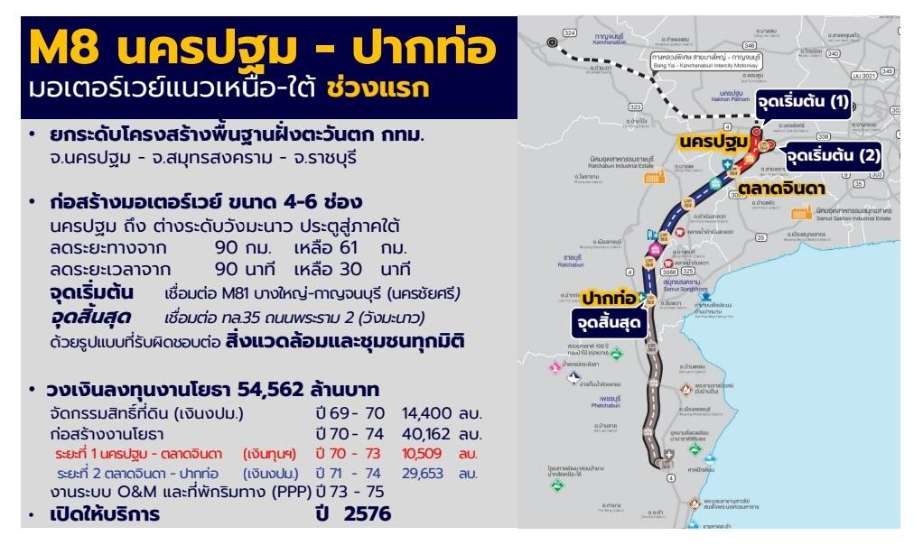 นายปิยพงษ์ จิวัฒนกุลไพศาล อธิบดีกรมทางหลวง (ทล.) เปิดเผยว่า ขณะนี้กรมทางหลวง ทล.ได้เตรียมความพร้อมนำเสนอโครงการให้คณะรัฐมนตรี (ครม.) ชุดใหม่ พิจารณาอนุมัติภายในปี 2569 จำนวน 3 โครงการ ได้แก่ 1.โครงการทางหลวงพิเศษระหว่างเมือง (มอเตอร์เวย์) หมายเลข 8 หรือ M8 ช่วงนครปฐม-ปากท่อ-ชะอำ ระยะที่ 1 (เฟส 1) ช่วงนครปฐม-ปากท่อ ระยะทาง 61 กิโลเมตร (กม.) โดยสถานะปัจจุบันอยู่ระหว่างรอจากหน่วยงานที่เกี่ยวข้อง ซึ่งกระทรวงการคลัง โดยสำนักงบประมาณได้แสดงความคิดเห็นส่งมาให้กระทรวงคมนาคมแล้วไม่มีข้อติดขัดใด เหลือรอความเห็นจากสำนักงานสภาพัฒนาการเศรษฐกิจและสังคมแห่งชาติ หรือสภาพัฒน์ (สศช.)ที่มีข้อกังวลเรื่องแหล่งเงิน และรูปแบบการดำเนินการ หากได้ข้อสรุปก็จะเข้าสู่ขั้นตอนการนำเสนอครม.พิจารณาต่อไป