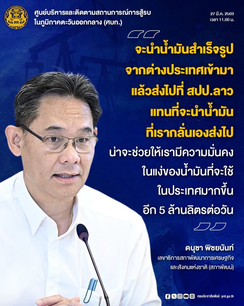 เลขาสภาพัฒน์ เผย นายกฯสั่งหาทางนำเข้าน้ำมันสำเร็จรูปจากต่างประเทศแล้วส่งต่อไปยัง สสป.ลาวแทน และเก็บน้ำมันที่กลั่นในประเทศไว้ใช้เอง ชี้ทำให้มีความมั่นคงทางน้ำมันเพิ่ม 5 ล้านลิตรต่อวัน