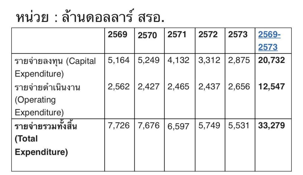และรายจ่ายดำเนินงาน (Operating Expenditureหรือ OPEX) จำนวน 2,562 ล้านดอลลาร์ สรอ. (เทียบเท่า 83,906 ล้านบาท) เพื่อรองรับแผนงาน ดังนี้