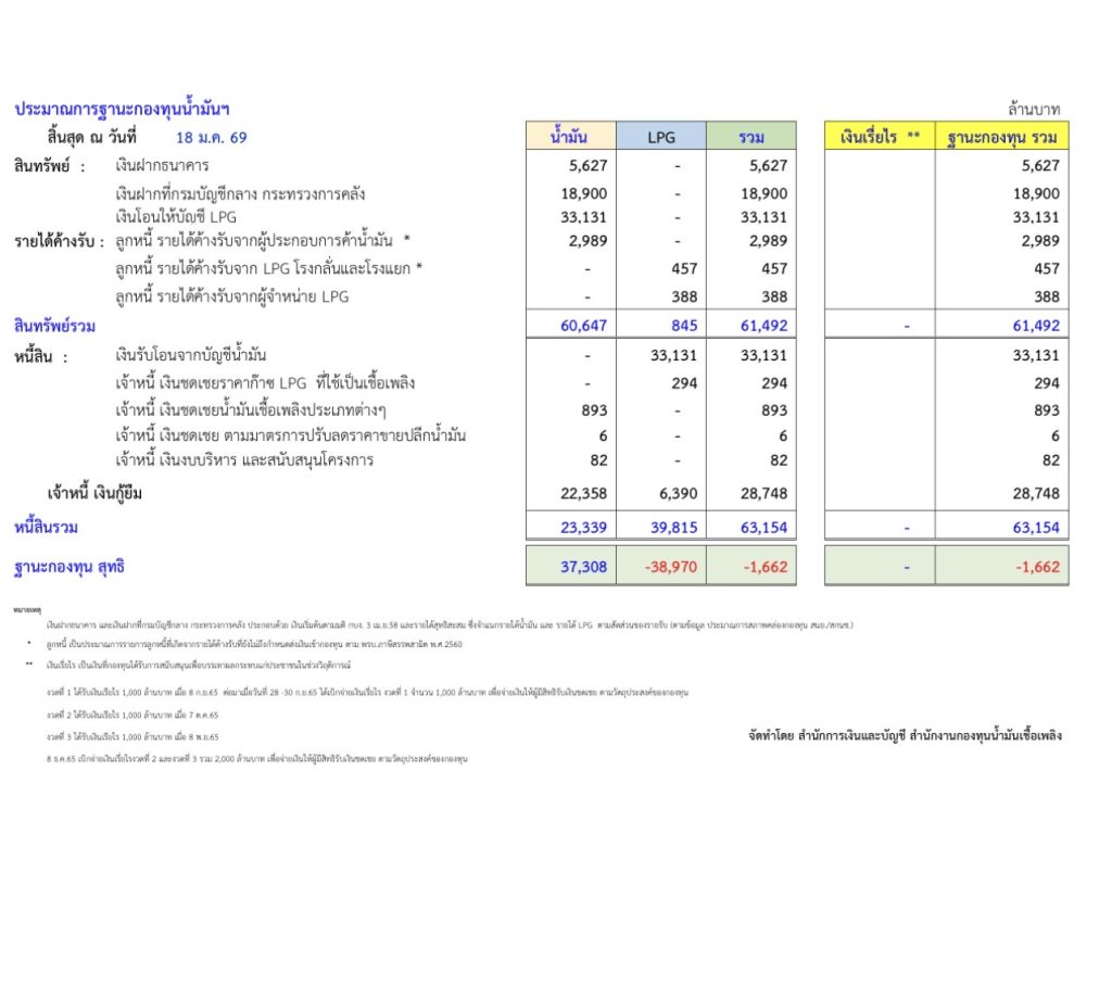 สำหรับ ฐานะกองทุนน้ำมันฯ ณ วันที่ 18 มกราคม 2569 กองทุนน้ำมันฯ ติดลบอยู่ที่ 1,662 ล้านบาท แบ่งเป็นบัญชีน้ำมันบวกอยู่ที่ 37,308 ล้านบาท และบัญชี LPG ติดลบอยู่ที่ 38,970 ล้านบาท ส่วนการปรับลดอัตราเงินส่งเข้ากองทุนน้ำมันฯ ประเภทน้ำมันดีเซลครั้งนี้ จะทำให้รายรับลดลงเหลือประมาณวันละ 50.06 ล้านบาท จากเดิมที่มีรายรับประมาณวันละ 94.86 ล้านบาท