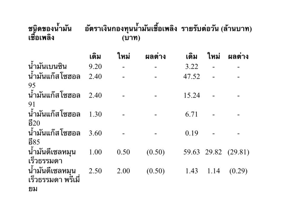 สำหรับ ฐานะกองทุนน้ำมันฯ ณ วันที่ 28 กันยายน 2568 กองทุนน้ำมันฯ ติดลบอยู่ที่ 17,838 ล้านบาท แบ่งเป็น บัญชีน้ำมันบวกอยู่ที่ 24,429 ล้านบาท และบัญชี LPG ติดลบอยู่ที่ 42,267 ล้านบาท ส่วนการปรับลดอัตราเงินส่งเข้ากองทุนน้ำมันฯ ประเภทน้ำมันดีเซลในครั้งนี้ จะทำให้รายรับน้ำมันดีเซลลดลงเหลือประมาณวันละ 30.96 ล้านบาท จากเดิมที่มีรายรับประมาณวันละ 61.06 ล้านบาท ขณะที่รายรับจากกลุ่มน้ำมันเบนซินยังคงไม่เปลี่ยนแปลง อยู่ที่ประมาณวันละ 93.80 ล้านบาทเท่าเดิม (รายละเอียดในตาราง)