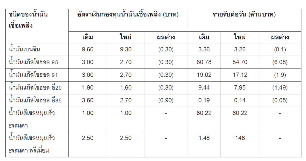 สำหรับประมาณการฐานะกองทุนน้ำมันฯ ณ วันที่ 19 ตุลาคม 2568 ปรับตัวดีขึ้นอย่างต่อเนื่อง โดยกองทุนน้ำมันฯ ติดลบอยู่ที่ 14,754 ล้านบาท แบ่งเป็น บัญชีน้ำมันบวกอยู่ที่ 26,910 ล้านบาท และบัญชี LPG ติดลบอยู่ที่ 41,664 ล้านบาท ส่วนการปรับลดอัตราเงินส่งเข้ากองทุนน้ำมันฯ ประเภทน้ำมันเบนซินในครั้งนี้ จะทำให้รายรับของน้ำมันเบนซินลดลงเหลือประมาณวันละ 83.17 ล้านบาท จากเดิมที่มีรายรับประมาณวันละ 92.79 ล้านบาท ขณะที่รายรับจากกลุ่มน้ำมันดีเซลยังคงไม่เปลี่ยนแปลง อยู่ที่ประมาณวันละ 61.70 ล้านบาทเท่าเดิม