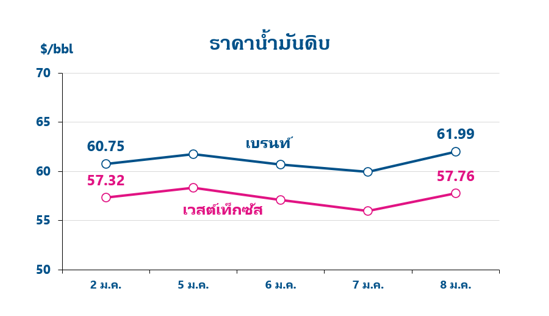 ส่วนสรุปสถานการณ์ราคาน้ำมันในสัปดาห์ที่ผ่านมา ระหว่างวันที่ 2 – 8 ม.ค. 69 พบว่าราคาน้ำมันดิบเวสต์เท็กซัสในสัปดาห์ที่ผ่านมาปรับลดลง 0.24 เหรียญสหรัฐฯ ต่อบาร์เรลมาอยู่ที่ 57.30 เหรียญสหรัฐฯ ต่อบาร์เรล ในขณะที่ราคาน้ำมันดิบเบรนท์ปรับลดลง 0.21 เหรียญสหรัฐฯ ต่อบาร์เรล มาอยู่ที่ 61.03 เหรียญสหรัฐฯ ต่อบาร์เรล หลังเวเนซุเอลาส่งสัญญาณพร้อมให้ความร่วมมือกับสหรัฐฯ ซึ่งอาจช่วยลดแรงกดดันจากการคว่ำบาตร และเปิดทางให้น้ำมันดิบเวเนซุเอลากลับเข้าสู่ตลาดโลกได้มากขึ้นในอนาคตขณะที่หุ้นบริษัทน้ำมันของสหรัฐฯปิดตลาดปรับตัวสูงขึ้นหลังการจับกุมประธานาธิบดีเวเนซุเอลานาย Maduro จากความหวังของนักลงทุนในการเข้าถึงแหล่งน้ำมันของเวเนซุเอลา ทั้งนี้ รัฐบาลของสหรัฐฯ มีแผนจะให้เงินอุดหนุนบริษัทน้ำมันของสหรัฐฯ เพื่อเข้าไปฟื้นฟูโครงสร้างพื้นฐานพลังงานของเวเนซุเอลาภายในเวลา 18 เดือน