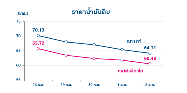 ส่วนสรุปสถานการณ์ราคาน้ำมันในสัปดาห์ที่ผ่านมา ระหว่างวันที่ 26 ก.ย. – 2 ต.ค. 68 พบว่า ราคาน้ำมันดิบเวสต์เท็กซัสในสัปดาห์ที่ผ่านมาปรับลดลง 0.98 เหรียญสหรัฐฯ ต่อบาร์เรลมาอยู่ที่ 62.76 เหรียญสหรัฐฯ ต่อบาร์เรล ในขณะที่ราคาน้ำมันดิบเบรนท์ปรับลดลง 1.01 เหรียญสหรัฐฯ ต่อบาร์เรล มาอยู่ที่ 66.92 เหรียญสหรัฐฯ ต่อบาร์เรลเนื่องจากอิรักและตุรกีบรรลุข้อตกลงในการดำเนินการส่งน้ำมันจากเคอร์ดิสถานของอิรักไปยังท่าเรือเจย์ฮานของตุรกีที่ประมาณ 150,000 – 160,000 บาร์เรลต่อวัน