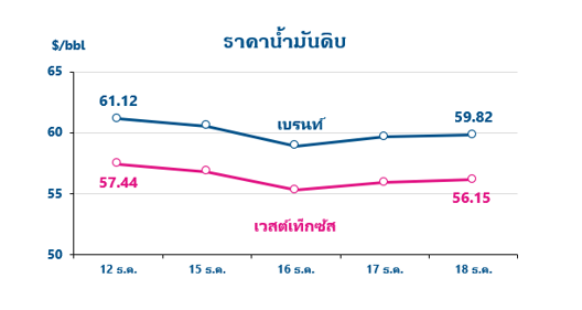 ส่วนสรุปสถานการณ์ราคาน้ำมันในสัปดาห์ที่ผ่านมา ระหว่างวันที่ 12 – 18 ธ.ค. 68 พบว่า ราคาน้ำมันดิบเวสต์เท็กซัสในสัปดาห์ที่ผ่านมาปรับลดลง 2.33 เหรียญสหรัฐฯ ต่อบาร์เรลมาอยู่ที่ 56.32 เหรียญสหรัฐฯ ต่อบาร์เรล ในขณะที่ราคาน้ำมันดิบเบรนท์ปรับลดลง 2.31 เหรียญสหรัฐฯ ต่อบาร์เรล มาอยู่ที่ 60.02 เหรียญสหรัฐฯ ต่อบาร์เรล หลังจากน้ำมันดิบรัสเซียยังคงถูกส่งออกอย่างต่อเนื่อง โดยตัวเลขการส่งออกน้ำมันดิบรัสเซีย เดือน พ.ย. 68 ปรับลดลงเพียง 0.8% จากเดือน ต.ค. 68 อยู่ที่ระดับ 7.5 ล้านตัน ขณะเดียวกัน ฝ่ายวิจัยสินค้าโภคภัณฑ์ของ J.P. Morgan รายงานว่าภาวะน้ำมันล้นตลาดในปีนี้จะยังคงดำเนินต่อไปในปี 2569 และ 2570 เนื่องจากอุปทานน้ำมันทั่วโลกจะเพิ่มขึ้นเร็วกว่าความต้องการใช้น้ำมัน ทำให้นักลงทุนยังคงกังวลเกี่ยวกับภาวะอุปทานที่อาจล้นตลาด อย่างไรก็ตาม สำนักงานสารสนเทศด้านพลังงานสหรัฐฯ (EIA) เผยตัวเลขปริมาณน้ำมันดิบคงคลังสหรัฐฯ ปรับตัวลดลงราว 1.3 ล้านบาร์เรล สู่ระดับ 424.4ล้านบาร์เรล ณ สิ้นสุดสัปดาห์วันที่ 12 ธ.ค.68 ซึ่งมากกว่าที่นักวิเคราะห์คาดไว้ว่าจะปรับตัวลดลงราว 1.1 ล้านบาร์เรล