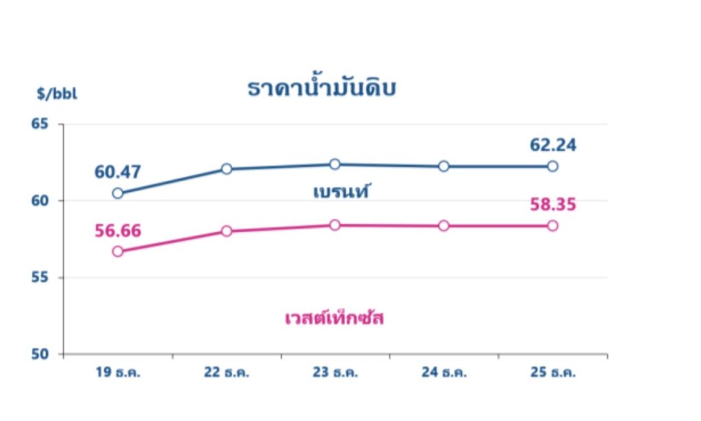 ส่วนสรุปสถานการณ์ราคาน้ำมันในสัปดาห์ที่ผ่านมา (19 – 25 ธ.ค. 2568 พบว่า ราคาน้ำมันดิบเวสต์เท็กซัสในสัปดาห์ที่ผ่านมาปรับเพิ่มขึ้น 1.63 เหรียญสหรัฐฯ ต่อบาร์เรลมาอยู่ที่ 57.95 เหรียญสหรัฐฯ ต่อบาร์เรล ในขณะที่ราคาน้ำมันดิบเบรนท์ปรับเพิ่มขึ้น 1.86 เหรียญสหรัฐฯ ต่อบาร์เรล มาอยู่ที่ 61.88 เหรียญสหรัฐฯ ต่อบาร์เรล เนื่องจากตลาดกังวลอุปทานน้ำมันดิบอาจเผชิญความเสี่ยงหลังสหรัฐฯ เข้มงวดกับเวเนซุเอลามากขึ้น รวมทั้งมีแนวโน้มที่เพิ่มความเสี่ยงในการที่จะต้องปิดกำลังการผลิตบางส่วนเพิ่มเติมด้วย