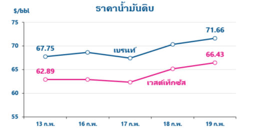 ส่วนสรุปสถานการณ์ราคาน้ำมันในสัปดาห์ที่ผ่านมา ระหว่างวันที่ 13-19 ก.พ. 69 พบว่า ราคาน้ำมันดิบเวสต์เท็กซัสในสัปดาห์ที่ผ่านมาปรับเพิ่มขึ้น 0.08 เหรียญสหรัฐฯ ต่อบาร์เรลมาอยู่ที่ 63.95 เหรียญสหรัฐฯ ต่อบาร์เรล ในขณะที่ราคาน้ำมันดิบเบรนท์ปรับเพิ่มขึ้น 0.60 เหรียญสหรัฐฯ ต่อบาร์เรล มาอยู่ที่ 69.17 เหรียญสหรัฐฯ ต่อบาร์เรล เนื่องจากสถานการณ์ความไม่สงบระหว่างสหรัฐฯ และอิหร่านมีความตึงเครียดมากขึ้น โดยสหรัฐฯ ส่งเครื่องบินรบและกองเรือพิฆาตมาประจำการใกล้อิหร่านเพิ่มขึ้นอย่างมีนัยสำคัญ เพื่อกดดันให้อิหร่านยอมทำข้อตกลงนิวเคลียร์ แม้ว่าการหารือระหว่างสหรัฐฯ และอิหร่านรอบที่ 2 เมื่อวันที่ 17 ก.พ. 69 ที่ผ่านมา ณ กรุงเจนีวา ประเทศสวิตเซอร์แลนด์ ซึ่งมีโอมานเป็นคนกลาง สามารถตกลงกันในแนวทางเบื้องต้นสำหรับการเจรจานิวเคลียร์ต่อไป ทั้งนี้ ประธานาธิบดีสหรัฐฯ นาย Donald Trump ขู่จะส่งเครื่องบินทิ้งระเบิด B-2 โจมตีอิหร่านหากการเจรจาล้มเหลว