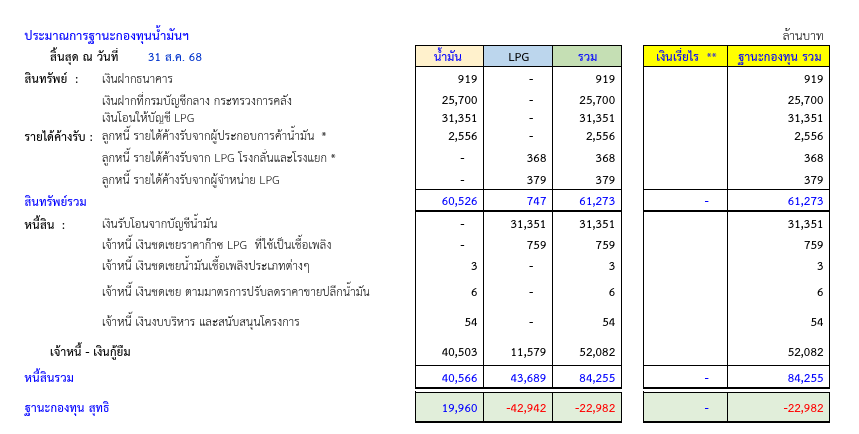 ผู้สื่อข่าว รายงานว่า จากการเผยแพร่ข้อมูลสถานการณ์เงินกองทุนน้ำมันเชื้อเพลิง ของ สำนักงานกองทุนน้ำมันเชื้อเพลิง (สกนช.) ล่าสุด ณ วันที่ 31 ส.ค. 2568 พบว่า กองทุนฯ ติดลบเหลือ 22,982 ล้านบาท แบ่งเป็นบัญชีน้ำมันฯ อยู่ที่ 19,960 ล้านบาท และบัญชี LPG ติดลบรวม 42,942 ล้านบาท