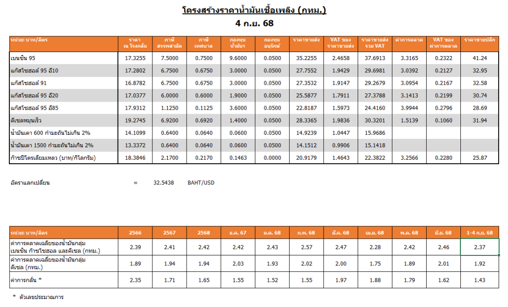 ขณะที่ สำนักงานนโยบายและแผนพลังงาน (สนพ.) เปิดเผย ค่าการตลาดน้ำมันที่ผู้ค้าเรียกเก็บจากประชาชน ล่าสุด วันที่ 4 ก.ย. 2568 พบว่า น้ำมันเบนซินออกเทน 95 ถูกเรียกเก็บค่าการตลาด 3.31 บาทต่อลิตร, น้ำมันแก๊สโซฮอล์ 95 มีค่าการตลาดที่ 3.03 บาทต่อลิตร, น้ำมันแก๊สโซฮอล์ 91 อยู่ที่ 3.09 บาทต่อลิตร, น้ำมันแก๊สโซฮอล์ E20 อยู่ที่ 3.14 บาทต่อลิตร, น้ำมันแก๊สโซฮอล์ E85 อยู่ที่ 3.99 บาทต่อลิตร, ดีเซล อยู่ที่ 1.51 บาทต่อลิตร โดยค่าการตลาดเฉลี่ย ระหว่างวันที่ 1- 4 ก.ย. 2568 อยู่ที่ 2.37 บาทต่อลิตร (จากค่าการตลาดที่เหมาะสม 1.5-2 บาทต่อลิตร)