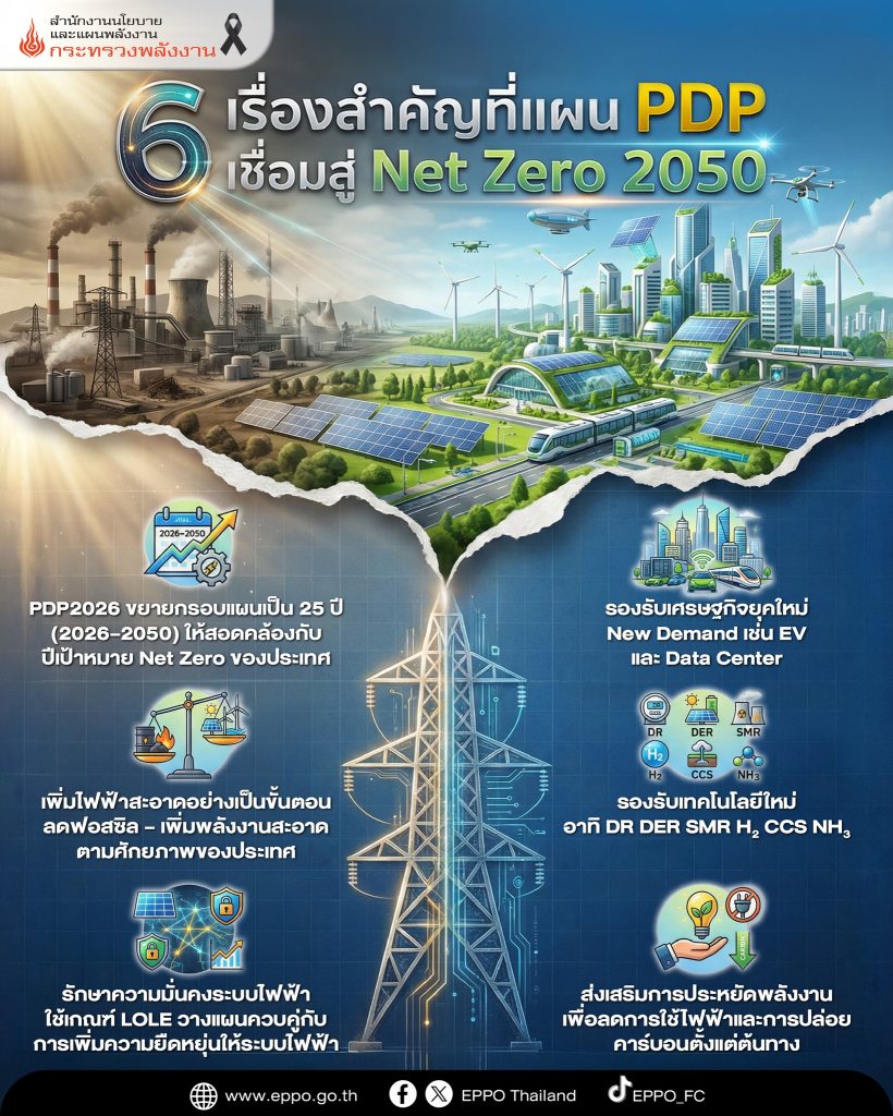 สำนักงานนโยบายและแผนพลังงาน (สนพ.) กระทรวงพลังงาน เปิดแผนร่างแผนพัฒนากำลังการผลิตไฟฟ้าของประเทศ ระหว่างปี 2569 -2593 (ฉบับใหม่) หรือ PDP 2026 ที่เป็นเสมือนกลไกสำคัญในการกำหนดทิศทางการเปลี่ยนผ่านสู่ Net Zero 2050 โดยมีรายละเอียดใน 6 เรื่องสำคัญ ดังนี้