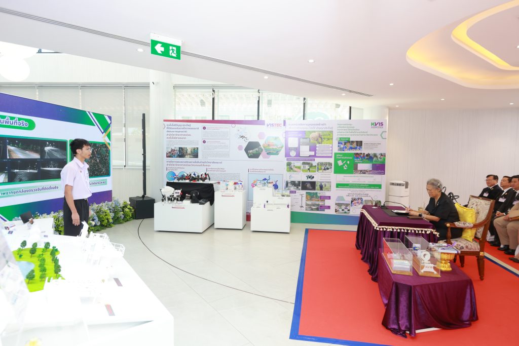 จากนั้นทรงทอดพระเนตรความคืบหน้าผลงานวิชาการ งานวิจัยและนวัตกรรมของสถาบันวิทยสิริเมธี โรงเรียนกำเนิดวิทย์ และบริษัท ปตท.สำรวจและผลิตปิโตรเลียม จำกัด (มหาชน) อาทิ ความก้าวหน้าและทิศทางในอนาคตของการพัฒนาเทคโนโลยีและประยุกต์ใช้วัสดุดูดซับขั้นสูงที่เรียกว่า Metal–Organic Frameworks (MOFs) พร้อมประยุกต์ใช้ในการดักจับก๊าซคาร์บอนไดออกไซด์ นำไปสู่การใช้ประโยชน์และการกักเก็บคาร์บอน หรือ Carbon Capture Utilization and Storage