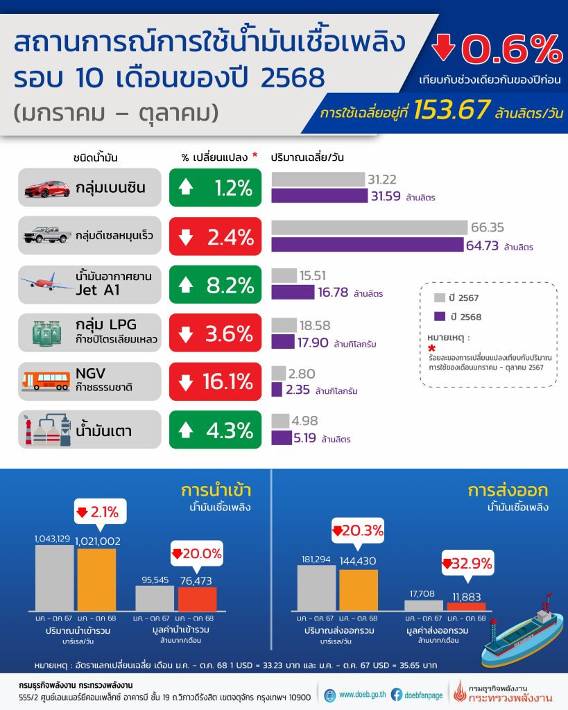 นายสราวุธ แก้วตาทิพย์ อธิบดีกรมธุรกิจพลังงาน เปิดเผยภาพรวมการใช้น้ำมันเชื้อเพลิงของประเทศไทย ในช่วง10 เดือนแรกปั 2568 (มกราคม – ตุลาคม) พบว่า มีปริมาณอยู่ที่ 153.67 ล้านลิตร/วัน ลดลงร้อยละ 0.6 เมื่อเทียบกับช่วงเดียวกันของปีก่อน โดยก๊าซธรรมชาติสำหรับยานยนต์ (NGV) มีปริมาณการใช้ลดลงสูงสุด ที่ร้อยละ 16.1 ตามด้วยก๊าซปิโตรเลียมเหลว (LPG) ลดลงร้อยละ 3.6 และน้ำมันดีเซลหมุนเร็วลดลงร้อยละ 2.4 ขณะที่น้ำมันอากาศยานเชิงพาณิชย์ (Jet A1) มีปริมาณการใช้เพิ่มขึ้นร้อยละ 8.2 การใช้น้ำมันเตาเพิ่มขึ้นร้อยละ 4.3 และกลุ่มเบนซินเพิ่มขึ้นร้อยละ 1.2