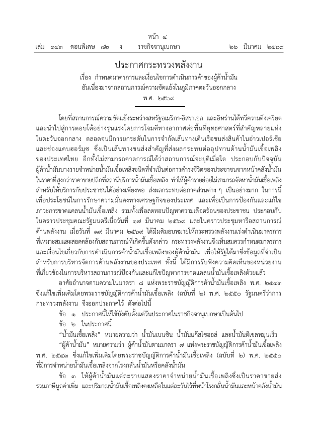 วันนี้ (27 มี.ค.2569) เว็บไซต์ราชกิจจานุเบกษา เผยแพร่ประกาศของ กระทรวงพลังงาน เรื่อง “กำหนดมาตรการและเงื่อนไขการดำเนินการค้าของ ผู้ค้าน้ำมัน อันเนื่องมาจากสถานการณ์ความขัดแย้งในภูมิภาคตะวันออกกลาง พ.ศ.2569” ลงนามโดย นายอรรถพล ฤกษ์พิบูลย์ รัฐมนตรีว่าการกระทรวงพลังงาน และมีผลบังคับใช้ตั้งแต่วันที่ประกาศในราชกิจจานุเบกษาเป็นต้นไป