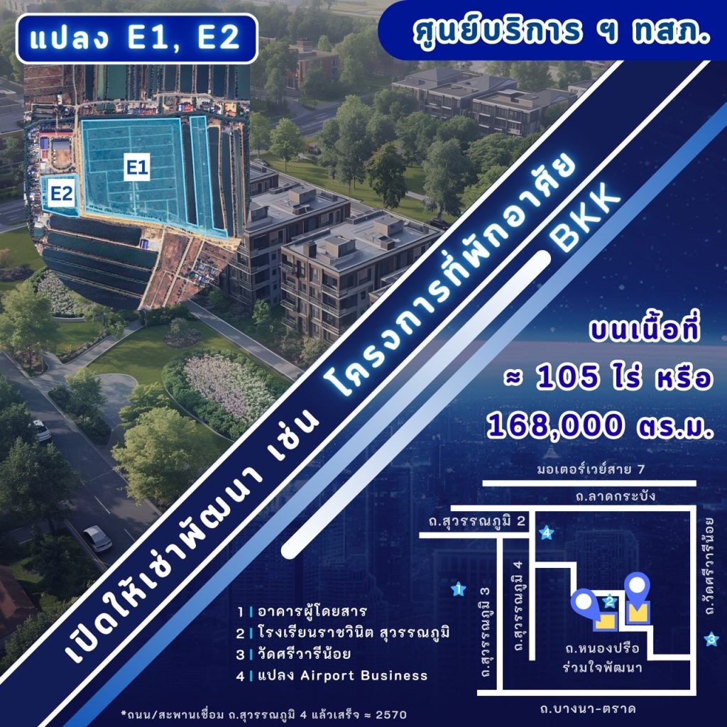 ท่าอากาศยานสุวรรณภูมิ ที่ดิน Airport Business แปลง B ขนาด 275 ไร่ ภายในท่าอากาศยานสุวรรณภูมิ ติดถนนหลัก และเดินทางไปอาคารผู้โดยสารเพียง 9 นาที ที่ดินศูนย์บริการและสนับสนุนกิจการท่าอากาศยานสุวรรณภูมิ แปลง E ขนาด 105 ไร่