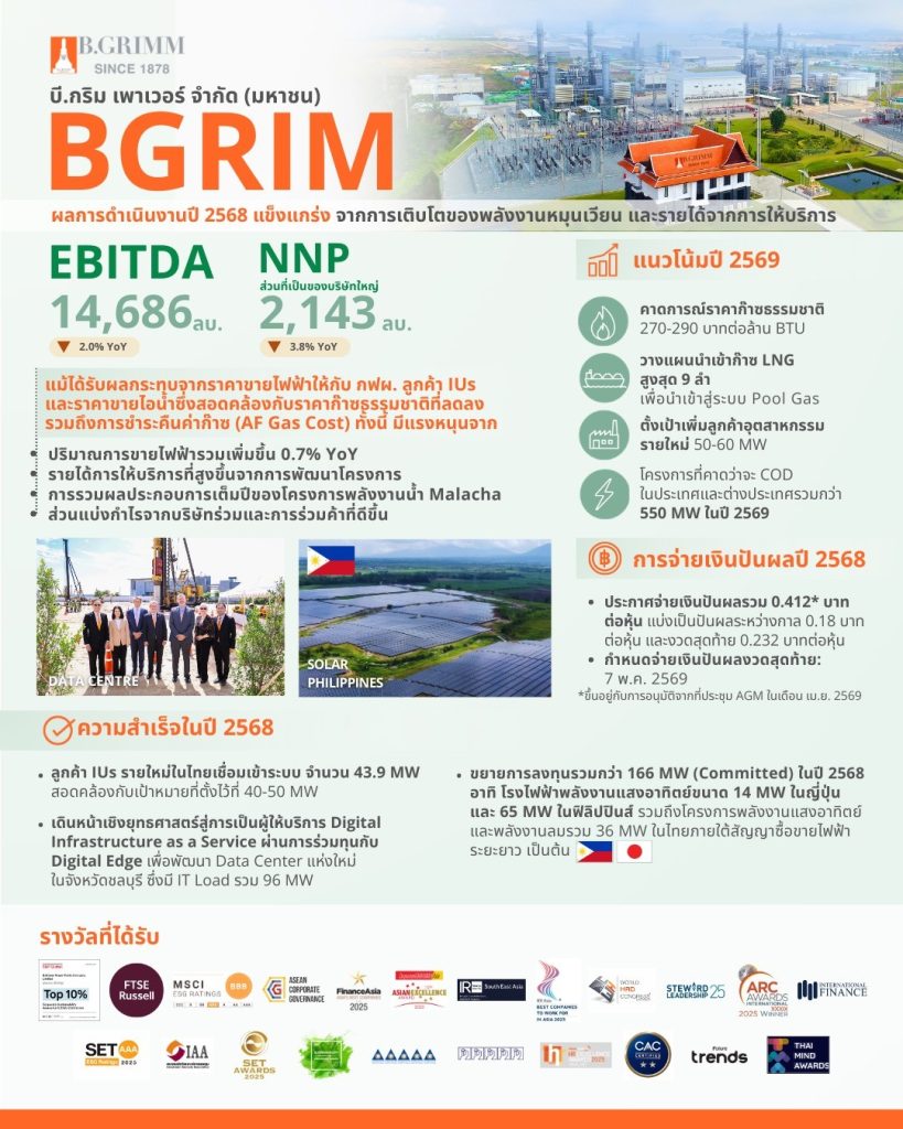 “บี.กริม เพาเวอร์” จ่อนำเข้า LNG ปี69 ไม่เกิน 9 ลำ ป้อนลูกค้า IUs รายใหม่ เชื่อมเข้าระบบรวม 50-60 เมกะวัตต์ คาดราคาก๊าซฯ เฉลี่ยอยู่ที่ 270-290 บาทต่อล้านบีทียู ต่ำกว่าปี2568 เคาะจ่ายปันผลงวดครึ่งหลังปี2568 อัตราหุ้นละ 0.232 บาท กำหนดจ่าย 7 พ.ค.2569 พร้อมโชว์ผลการดำเนินงานปี 2568 แข็งแกร่ง พอร์ตพลังงานหมุนเวียนเติบโตสูง ลูกค้าอุตสาหกรรมขยายตัวต่อเนื่อง