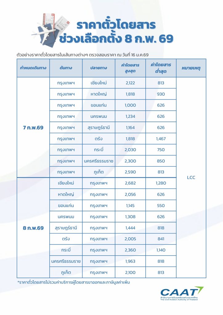 ทั้งนี้ CAAT จะยังคงติดตามและกำกับดูแลราคาค่าบัตรโดยสารอย่างต่อเนื่องในช่วงก่อนและระหว่างวันเลือกตั้ง เพื่อให้การจำหน่ายบัตรโดยสารเป็นไปอย่างเป็นธรรม โปร่งใส และไม่สร้างภาระเกินสมควรแก่ประชาชน พร้อมขอความร่วมมือสายการบินให้บริหารจัดการเที่ยวบินและที่นั่งอย่างเหมาะสม เพื่ออำนวยความสะดวกแก่ผู้ที่ต้องการเดินทางกลับภูมิลำเนาไปใช้สิทธิเลือกตั้ง หากประชาชนพบการจำหน่ายบัตรโดยสารในราคาที่เกินอัตราเพดาน หรือไม่ได้รับความเป็นธรรมในการให้บริการ สามารถแจ้งเรื่องร้องเรียนมายัง CAAT ได้ที่เว็บไซต์ complaint.caat.or.th