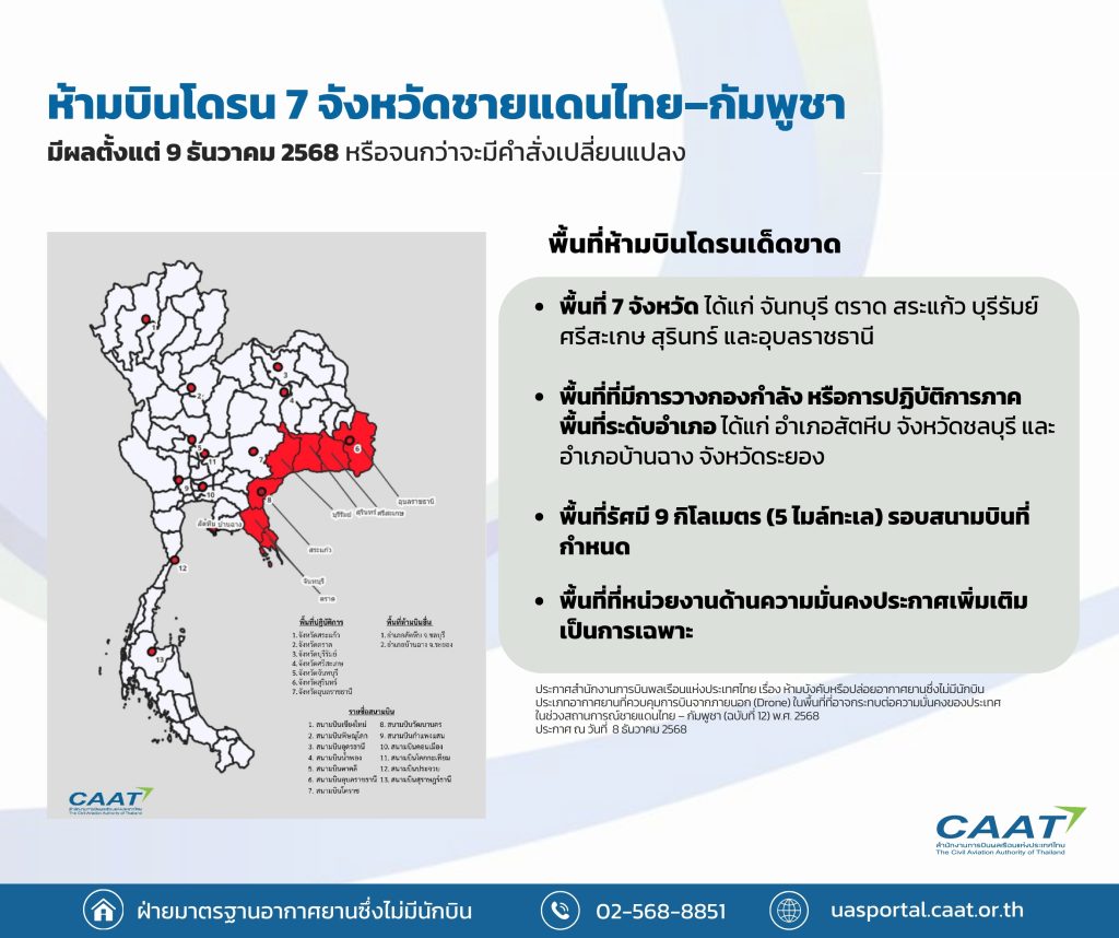 CAAT ออกประกาศฉบับที่ 12 ห้ามบินโดรน 7 จังหวัดชายแดนไทย–กัมพูชา และพื้นที่ที่มีการปฏิบัติการ เพื่อความมั่นคงและความปลอดภัยการบิน มีผลบังคับใช้ 9 ธ.ค. 68