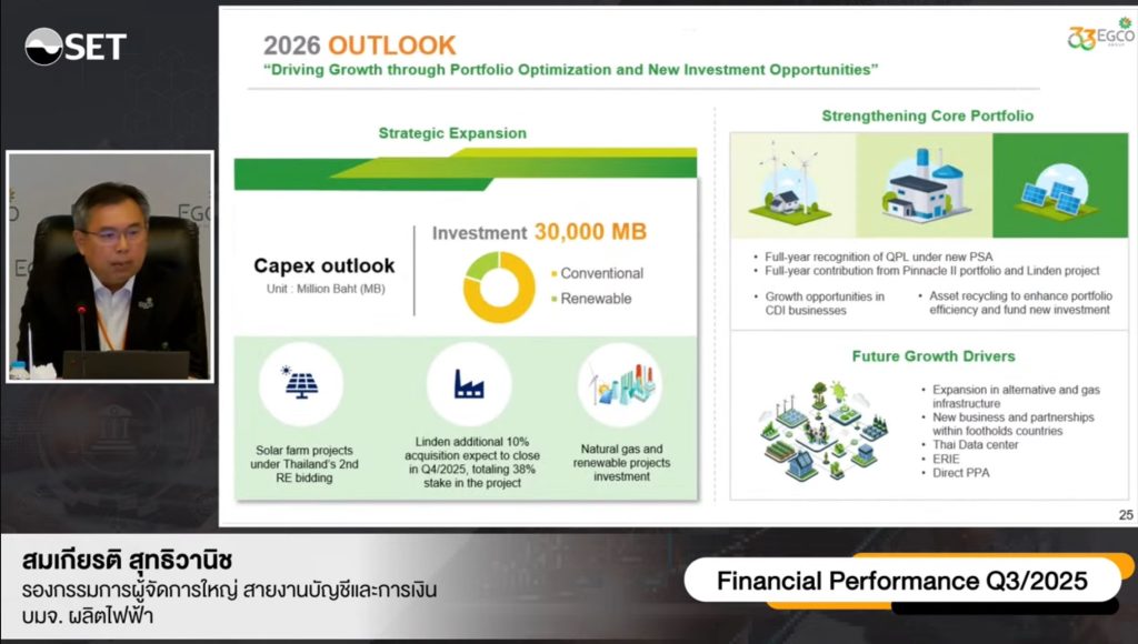 นายสมเกียรติ สุทธิวานิช รองกรรมการผู้จัดการใหญ่ สายงานบัญชีและการเงิน บริษัท ผลิตไฟฟ้า จำกัด (มหาชน) หรือ EGCO Group เปิดเผยในงาน Oppday Q3/2025 ของ EGCO วันที่ 28 พ.ย.2568 โดยระบุว่า ในปี 2569 บริษัทตั้งงบลงทุนอยู่ที่ 30,000 ล้านบาท เท่ากับปี 2568 โดยคาดว่าจะใช้งบประมาณได้ตามเป้าจากปี 2568 ที่ทำได้ต่ำกว่าเป้าหมาย ซึ่งจะเน้นการลงทุนในโครงการที่เกี่ยวข้องกับพลังงานเป็นหลักทั้งโรงไฟฟ้าก๊าซธรรมชาติและโรงไฟฟ้าพลังงานหมุนเวียน รวมถึงมุ่งเน้นการนำรายได้ไปแสวงหาโอกาสการลงทุนใหม่ (Asset Recycling) ตามนโยบายของ นายธวัชชัย สำราญวานิช กรรมการผู้จัดการใหญ่ EGCO Group คนใหม่