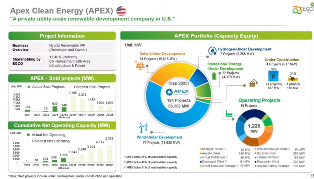 อีกทั้ง EGCO Group ยังเดินหน้าลงทุนเชิงกลยุทธ์อย่างต่อเนื่อง ทั้งจากการแสวงหาโอกาสการลงทุนในธุรกิจไฟฟ้าซึ่งเป็นธุรกิจหลัก จากโรงไฟฟ้าก๊าซธรรมชาติคุณภาพสูงและโรงไฟฟ้าพลังงานหมุนเวียนเพื่อเป้าหมาย Net Zero ผ่านการลงทุนทั้งรูปแบบการควบรวมและซื้อกิจการ (Mergers and Acquisitions – M&A) ที่จะเกิดขึ้นในปี2569 และการลงทุนพัฒนาโครงการใหม่ (Greenfield) โดยต่อยอดและเน้นการลงทุนในประเทศที่มีฐานธุรกิจและพันธมิตรอยู่แล้ว โดยเฉพาะสหรัฐอเมริกา ซึ่งเป็นหนึ่งในฐานธุรกิจที่สำคัญของ EGCO Group ที่ได้เข้าไปลงทุนมาอย่างต่อเนื่องในช่วง 5 ปีที่ผ่านมา
