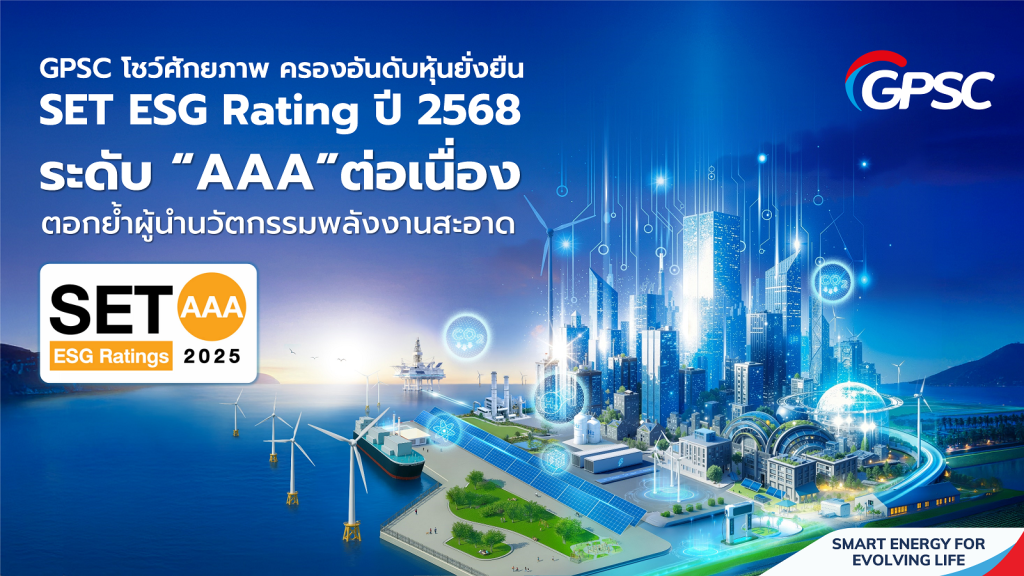 GPSC ผู้นำนวัตกรรมธุรกิจไฟฟ้ากลุ่ม ปตท. ตอกย้ำศักยภาพองค์กรยั่งยืน หลังได้รับการจัดอันดับ SET ESG Rating ปี 2568 ระดับ “AAA” กลุ่มทรัพยากร (Resources) อย่างต่อเนื่อง จากตลาดหลักทรัพย์แห่งประเทศไทย สะท้อนการดำเนินธุรกิจที่ผสานมิติสิ่งแวดล้อม สังคม และธรรมาภิบาลอย่างเป็นรูปธรรม รองรับการเปลี่ยนผ่านด้านพลังงานโลก และการเติบโตอย่างมั่นคงในระยะยาว