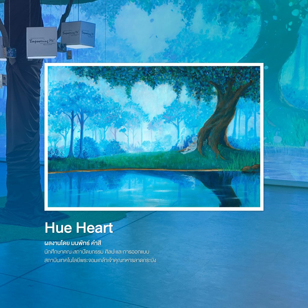 2) “Hue Heart” ผลงาน “มนพัทธ์ คำสี” นักศึกษาชั้นปีที่ 2 คณะสถาปัตยกรรม ศิลปะและการออกแบบ สถาบันเทคโนโลยีพระจอมเกล้าเจ้าคุณทหารลาดกระบัง ถ่ายทอดตัวตน “น้องคิว – นายภาคิน โซ๊ะเลาะ” ที่เปรียบตนเองดั่งต้นไม้ ไม่ว่าจะผ่านร้อนหรือผ่านหนาว สุดท้ายมันก็ยังยืนหยัดในตัวตน เพื่อวันหนึ่งจะกลายเป็นป่าใหญ่ที่งดงามและแข็งแกร่ง