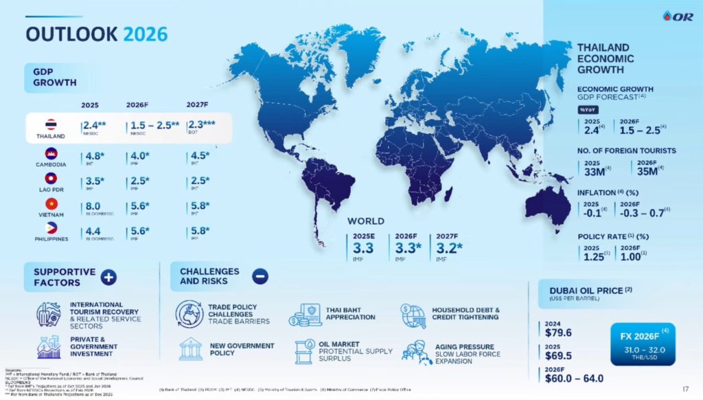 รวมถึงจำนวนนักท่องเที่ยวในปีนี้ที่คาดการณ์ว่า จะอยู่ที่ระดับ 35 ล้านคน เพิ่มขึ้นจากปี2568 ที่ระดับ 33 ล้านคน ซึ่งจะเป็นปัจจัยสนับสนุนยอดขายน้ำมันอากาศยาน(Jet) ของ OR ให้ขยายตัวต่อเนื่อง จากปี2568 ที่มียอดขายเพิ่มขึ้น 10% สูงกว่าภาพรวมของอุตสาหกรรมฯนี้ ที่เติบโต 7% อีกทั้ง ตัวเลขคาดการณ์ราคาน้ำมันดิบดูไบ ปี2569 อยู่ในกรอบ 60-64 ดอลลาร์ต่อบาร์เรล ลดลงจากปี 2568 จะเป็นปัจจัยที่สนับสนุนมาร์จิ้นและยอดขายของน้ำมัน Jet ในปีนี้ ให้เพิ่มขึ้น