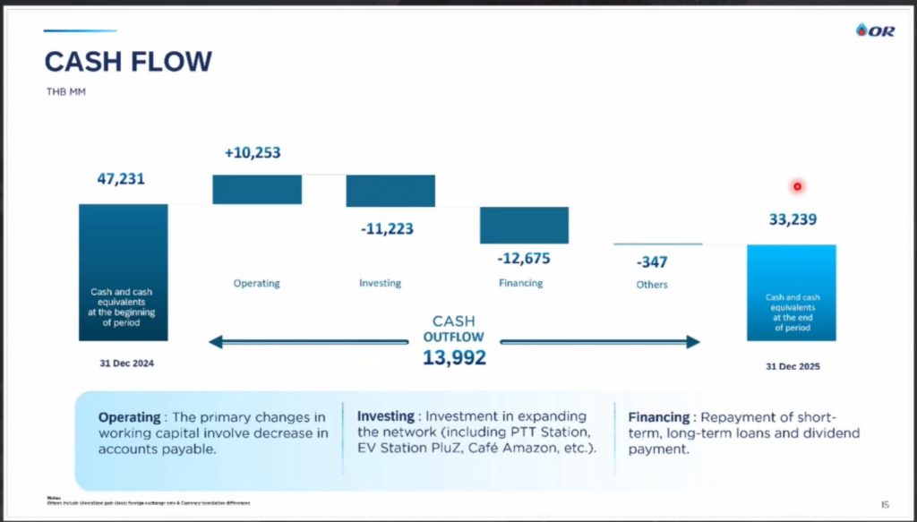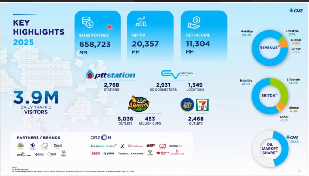 ทั้ง ข้อมูลสิ้นปี 2568 OR มีสถานีบริการ PTT Station ทั้งสิ้น 2,768 แห่ง แบ่งเป็นในประเทศ 2,410 แห่ง ในต่างประเทศ 358 แห่ง มีร้านคาเฟ่ อเมซอน อยู่ที่ 5,036 แห่ง แบ่งเป็นในประเทศ 4,705 แห่ง ในต่างประเทศ 331 แห่ง มีสถานีชาร์จ EV Station PluZ จำนวน 1,349 แห่ง หรือ ติดตั้ง 2,931 หัวชาร์จ(DC) ครอบคลุม 77 จังหวัด และมีร้าน Convenience Store จำนวน 2,468 สาขา โดย ณ 31 ธ.ค.2568 OR มีกระแสเงินสด อยู่ที่ระดับ 33,239 ล้านบาท