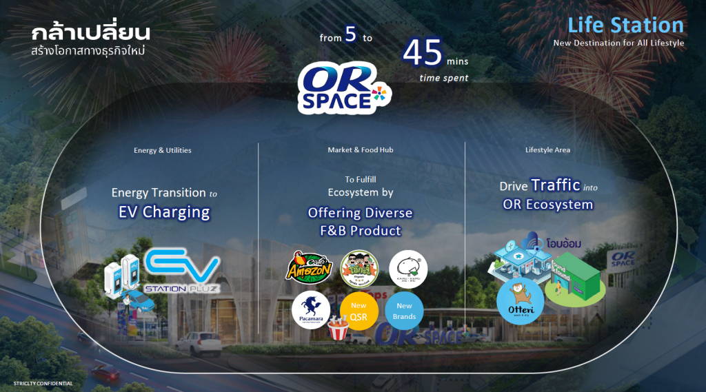 1.Time Spent Expansion เพิ่มเวลาใช้บริการในสถานีบริการจาก 5 นาที เป็น 45นาที ผ่านการพัฒนาพื้นที่ทั้ง PTT Station และOR SPACE รวมถึงบริการเสริมต่างๆในสถานีบริการ