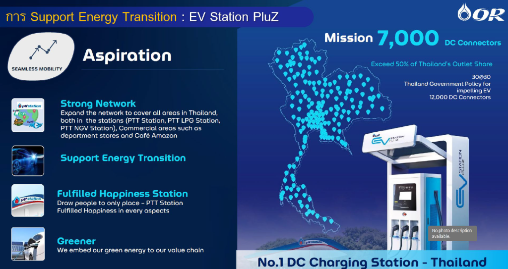 “OR EV Ecosystem & Future Trend สะท้อนบทบาทของ OR ในการขับเคลื่อนการเปลี่ยนผ่านพลังงานของประเทศผ่านโครงสร้างพื้นฐานยานยนต์ไฟฟ้า (EV) ที่ครบวงจร และตอบสนองต่อนโยบายของประเทศไทย ที่มีเป้าหมาย Net Zero ภายในปี 2050 โดยมีหนึ่งในแนวทางขับเคลื่อนคือกำหนดเป้าหมายให้ 30% ของรถยนต์ที่ผลิตในประเทศเป็นรถไฟฟ้าภายในปี 2030 และสนับสนุนการพัฒนาโครงข่ายสถานีชาร์จให้เพียงพอกับปริมาณรถไฟฟ้าที่จะเพิ่มขึ้น”