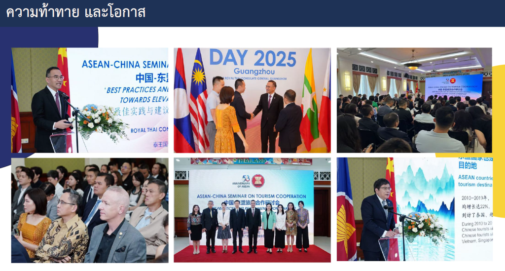 ด้านดร.ไพจิตร วิบูลย์ธนสาร รองประธานและเลขาธิการหอการค้าไทยในจีนเล่าว่า มิติด้านการท่องเที่ยว ปัจจุบันคนจีนมองว่าการท่องเที่ยวในประเทศไทยไม่ปลอดภัย ส่วนหนึ่งเป็นผลจากข่าวอาชญากรรมและเหตุการณ์ต่างๆ ข่าวถูกจับตัวเป็นแก๊งคอลเซ็นเตอร์ ซึ่งจีนก็พยายามแก้ไขปัญหาภายในประเทศ ทำให้การท่องเที่ยวของคนจีนในไทยตกต่ำสุด โดยการท่องเที่ยวแห่งประเทศไทย (ททท.) คาดการณ์ว่า ปลายปีนักท่องเที่ยวจีนในไทยจะแตะ 7-8 ล้านคน แต่ปัจจุบันน่าจะอยู่ที่ประมาณ 4 – 4.5 ล้านคน ซึ่งขณะนี้บรรยากาศในจีนดีขึ้นหลังจากพระมหากษัตริย์ไทยทรงเยือนจีนอย่างเป็นทางการระหว่างวันที่ 13-17 พฤศจิกายน 2567 เพื่อเฉลิมฉลองวาระครบรอบ 50 ปีความสัมพันธ์ทางการทูตไทย-จีน ซึ่งการเยือนครั้งนี้เป็นการกระชับความสัมพันธ์ระหว่างสองประเทศ และเสริมสร้างความเข้าใจที่ดีระหว่างประชาชนทั้งสองฝ่าย โดยคาดว่าจากนี้ไปจนถึงเทศกาลตรุษจีน จำนวนนักท่องเที่ยวจีนในประเทศไทยจะเติบโตเพิ่มขึ้น