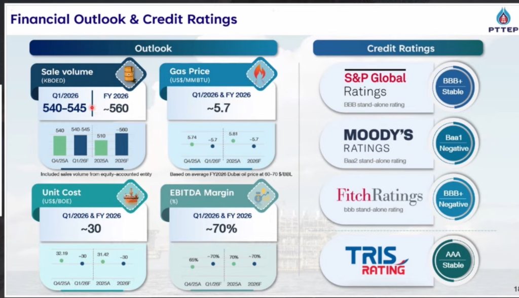 ด้านราคา LNG Spot ในช่วงไตรมาส 1 ปี2569 คาดว่าจะอยู่ในระดับใกล้เคียงกับทั้งปี 2569 เฉลี่ยอยู่ที่ 5.7 ดอลลาร์ต่อล้านบีทียู ภายใต้สมมุติฐานราคาน้ำมันดูไบเฉลี่ยทั้งปี 2569 อยู่ที่ระดับ 60-70 ดอลลาร์ต่อบาร์เรล และมีต้นทุนต่อหน่วย(Unit Cost) ทั้งปี 2569 เฉลี่ยอยู่ที่ 30 ดอลลาร์ต่อบาร์เรลเทียบเท่าน้ำมันดิบ รวมถึงอัตรากำไรที่ก่อนหักดอกเบี้ย ภาษี ค่าเสื่อมราคา และค่าตัดจำหน่ายได้ (EBITDA Margin) ทั้งปีนี้ คาดว่าจะรักษาระดับอยู่ในช่วง 70% ใกล้เคียงปีก่อน ซึ่งถือเป็นระดับที่บริษัทสามารถรักษาได้ตลอดมา